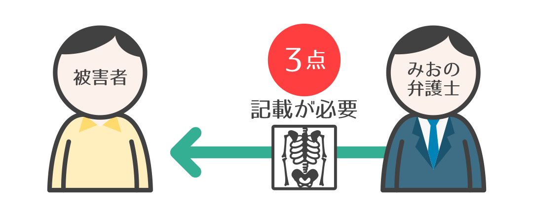 Kさんから症状固定時点で残っている症状を確認した結果、後遺障害診断書については、どのような痛みが残っているかの記載や、骨の状態の記載、今後の症状の見通しなどの記載が重要であると判断。その3点を中心に、後遺障害診断書に記載すべき内容をアドバイスしました。